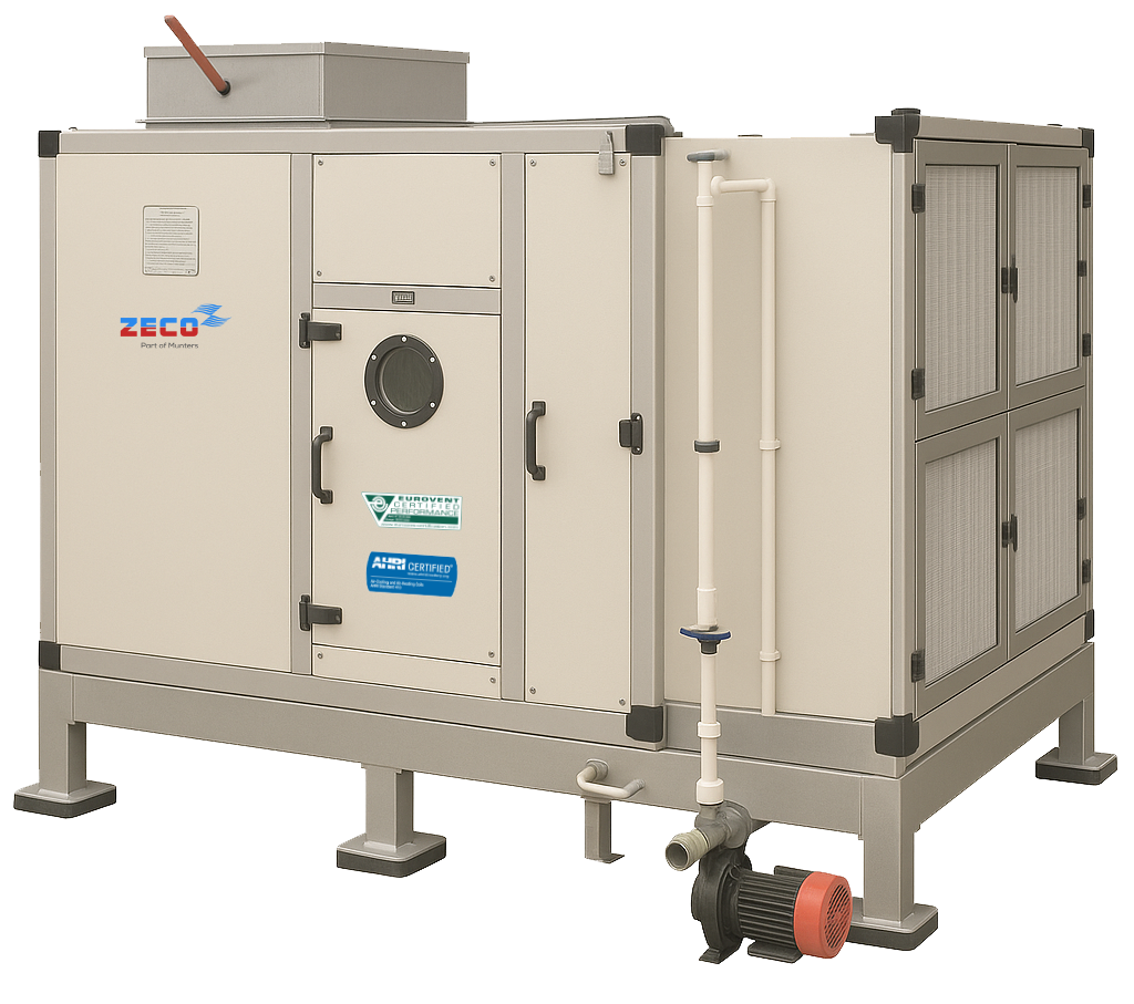 This system supports airflow capacities exceeding 100,000 CFM, making it adaptable for large-scale applications across commercial, healthcare, institutional, and manufacturing facilities. Constructed from corrosion-resistant galvanized or stainless steel, it houses a built-in water tank with automatic level control, vibration-isolated fan assemblies, and a robust dual-stage filtration system for enhanced IAQ.